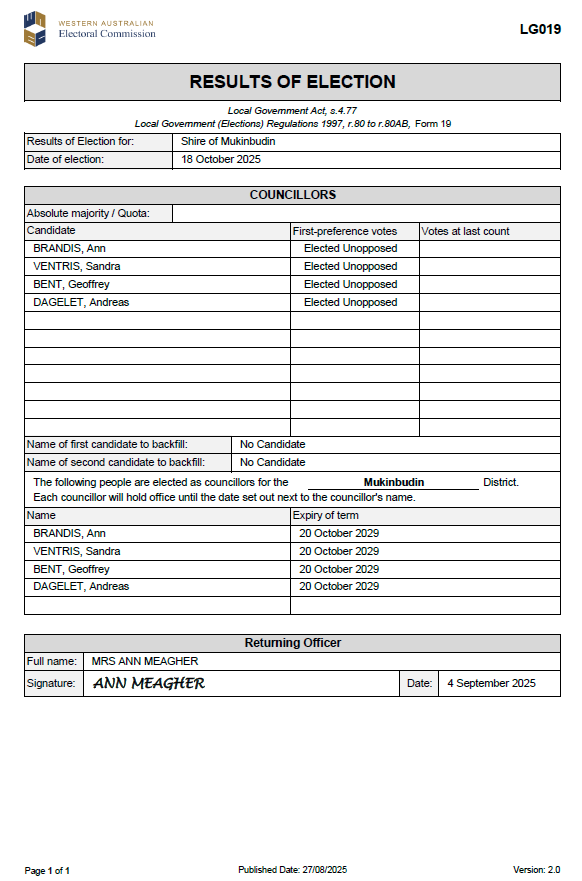 The next Ordinary elections will be held on 18th October 2025. The Shire of Mukinbudin local election will be conducted by postal vote.